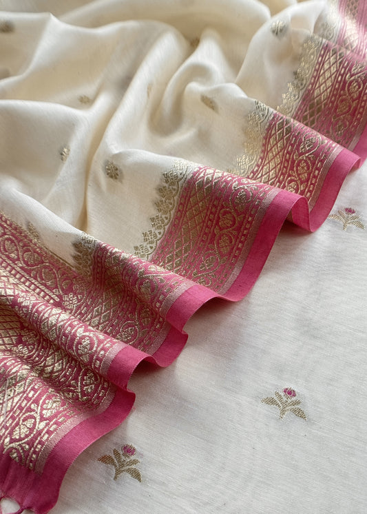 Ivory And Pink Summers Handloom Banarasi Unstitched Suit Fabric