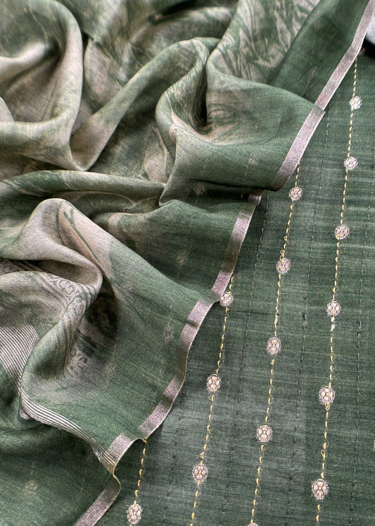 Forest Green Pure Chanderi Unstitched Suit With Banarasi Weaving And Digital Print