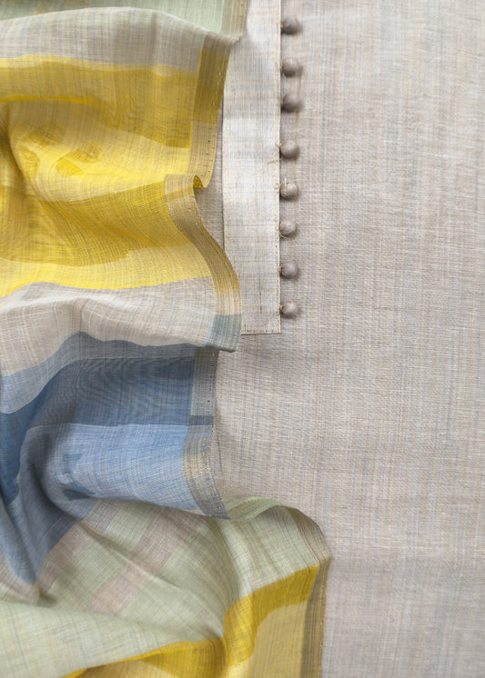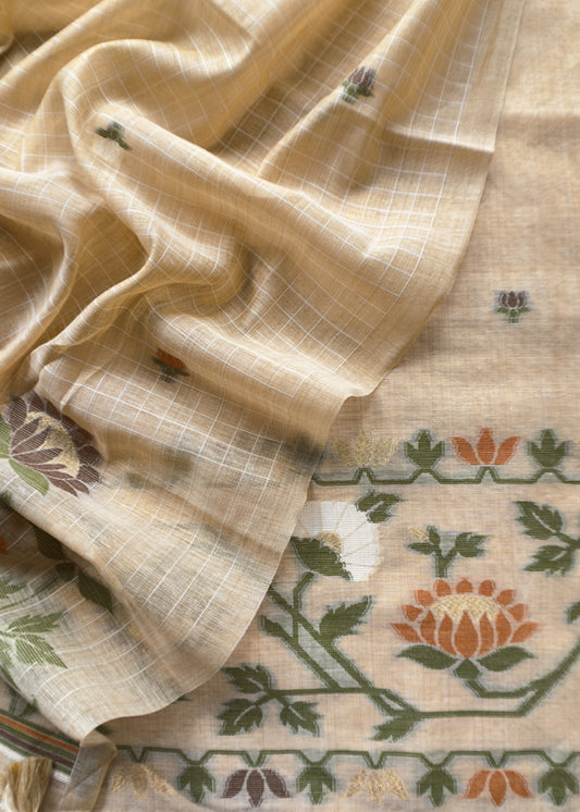 Beige Linen Chanderi Unstitched Suit With jamdani Weaving