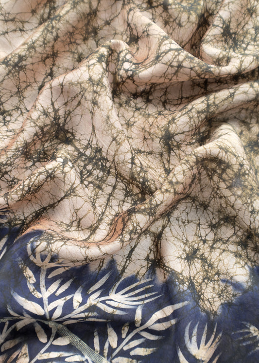 Beige And Blue Abstact Print Maheshwari Silk Suit With Gold Zari weaving