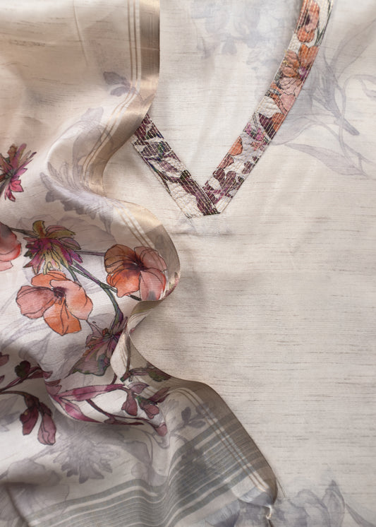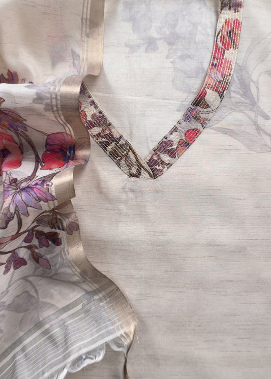 Beige Mul Chanderi Unstitched Suit With Multicolor Dupatta