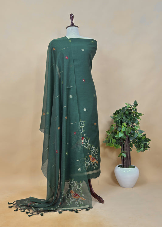 Green Linen Chanderi Unstitched Suit With Jamdani Weaving