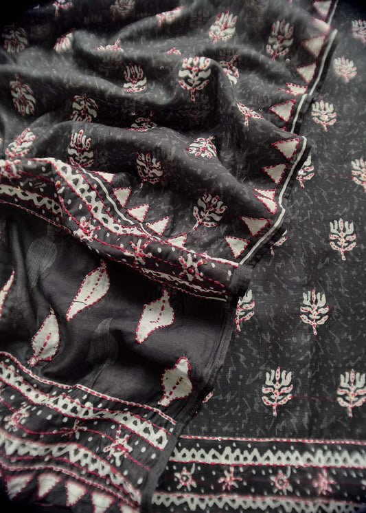 Black Chanderi Cotton Suit With Kantha Stitch Work