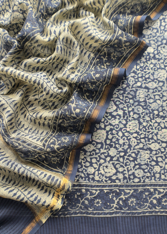 Indigo Paisley Block Print Pure Maheshwari Silk Unstitched Suit Fabric
