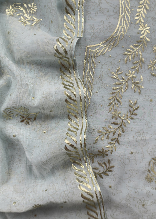 Powder Blue Pure Mul Chanderi Unstitched Suit With Hand Brushed Embroidery
