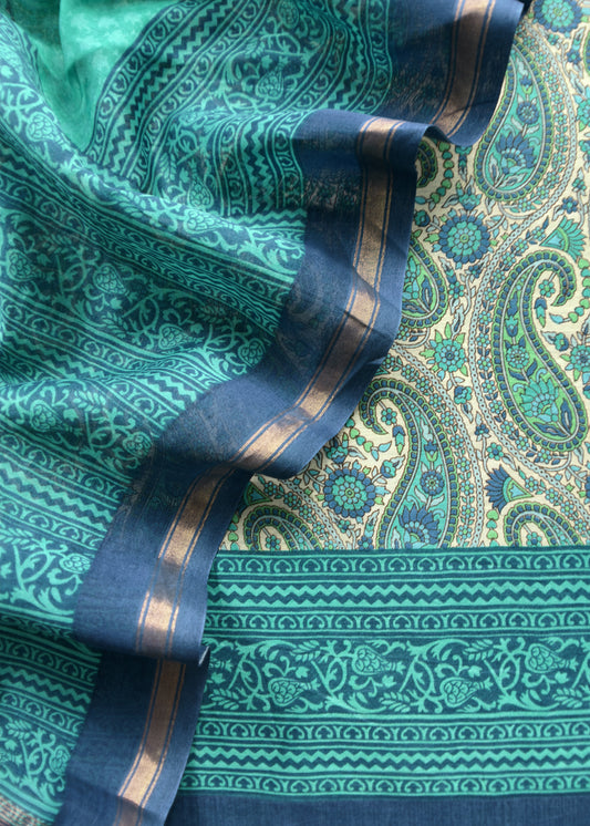 Turquoise And Blue Paisley Block Print Pure Maheshwari Silk Unstitched Suit