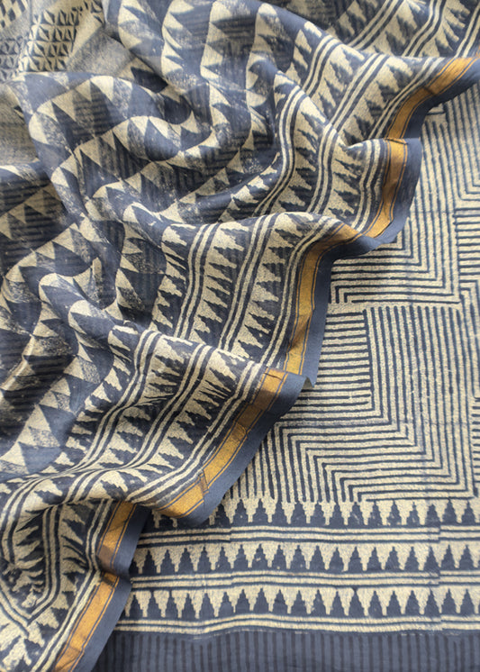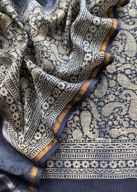 Indigo Paisley Block Print Pure Maheshwari Silk Unstitched Suit Fabric