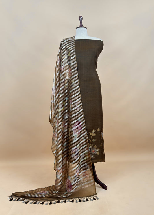 Navy Blue Banarasi Silk Brocade Suit With Organza Dupatta