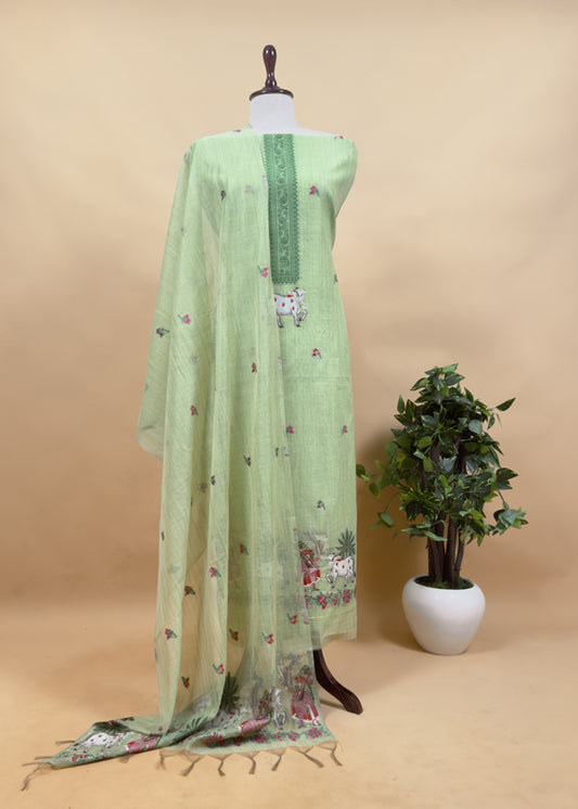 Pastel Blue Pichwai Jute Linen Suit Fabric With Shaded Jamdani Weaving