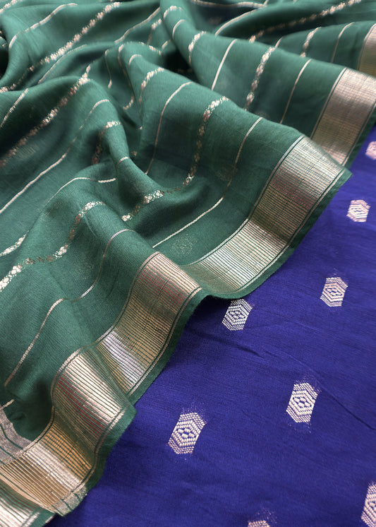 Blue and Green Pure Assamese Silk Suit Fabric With Zari Weaving
