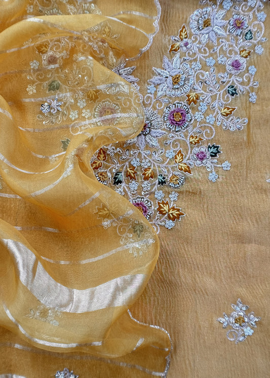 Luxe Gold Handloom Tissue Silk Suit Fabric With Dori Dabka Handwork