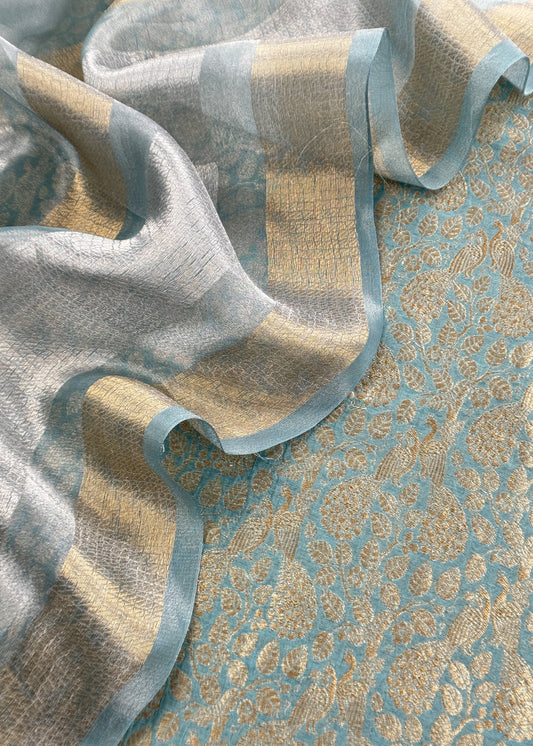 Blue Pure Palm Trees Brocade Silk Kurta And Zari Panel Silk upatta
