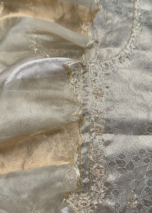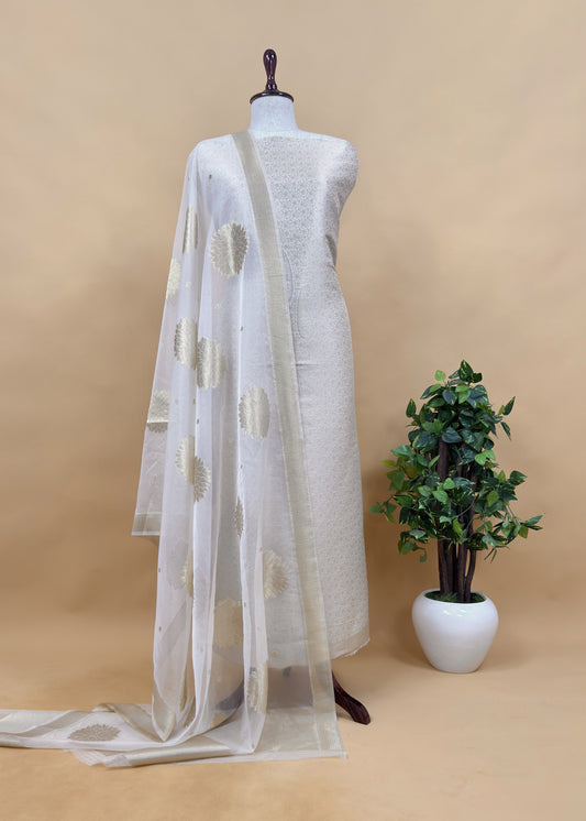 Off White Banarasi Silk Brocade Suit With Organza Dupatta