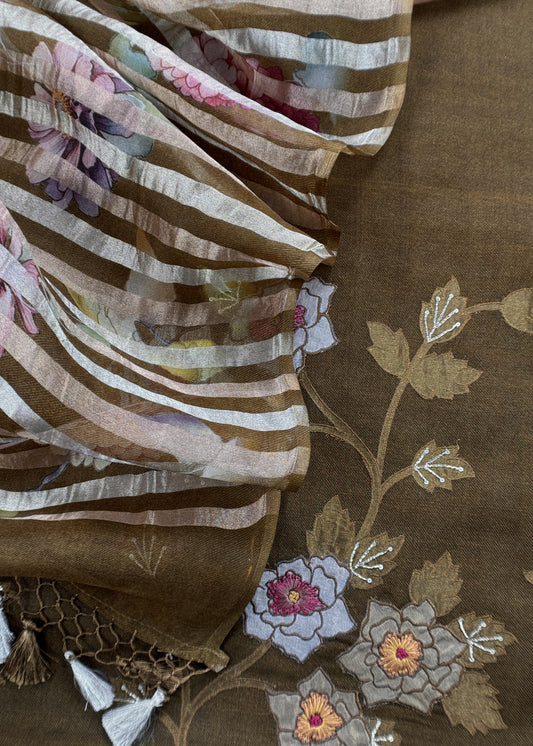 Wood Brown Kora Silk Suit Fabric With Appliqué Work And Hand Embroidery