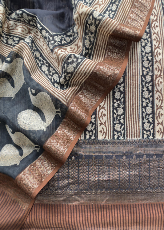 Brown- Sanganeri Block Printed Natural Dyed Ajrakh Suit In Chanderi