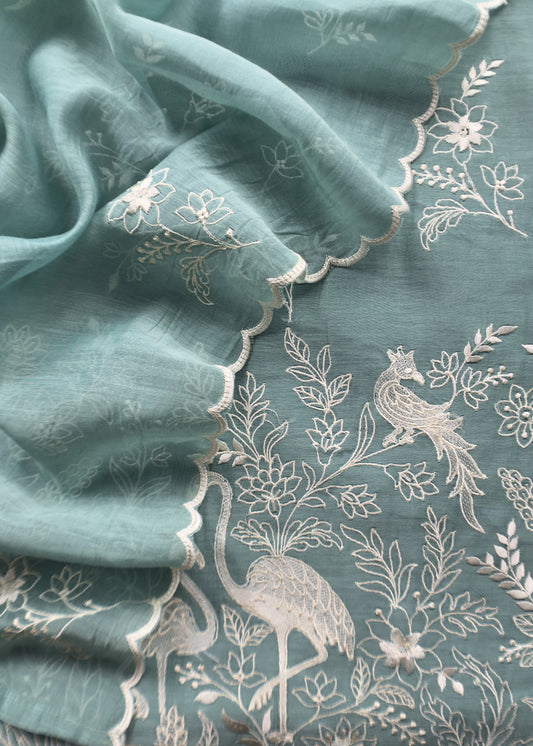 Basil Green Mul Chanderi Suit With Flamingo And Peacock Embroidery