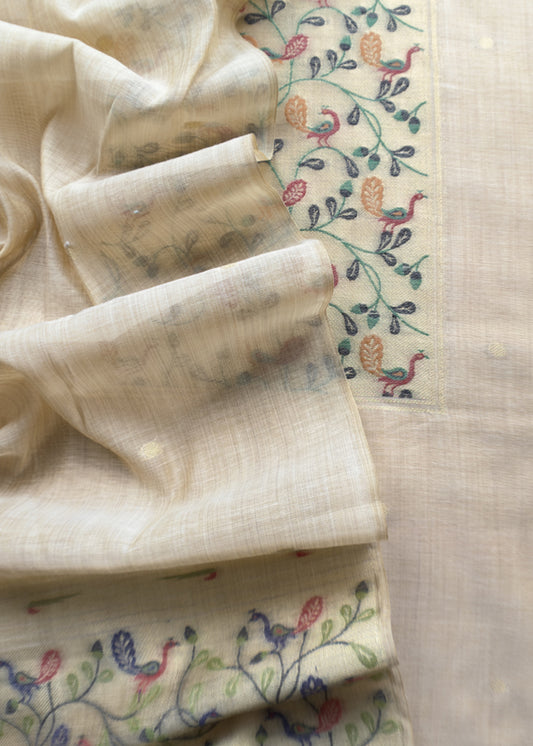 Beige Mor Paithani Style Jamdani weaving Suit in Linen Chanderi fabric