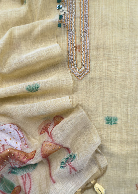 Beige Linen Chanderi Unstitched Suit With jamdani Weaving