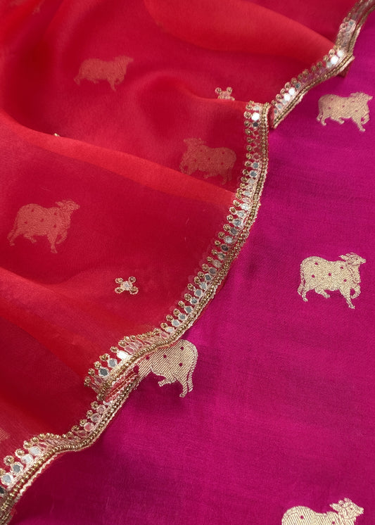 Deep Pink Pure Chiniya Silk Kurta And Kora Silk Dupatta With Handwork
