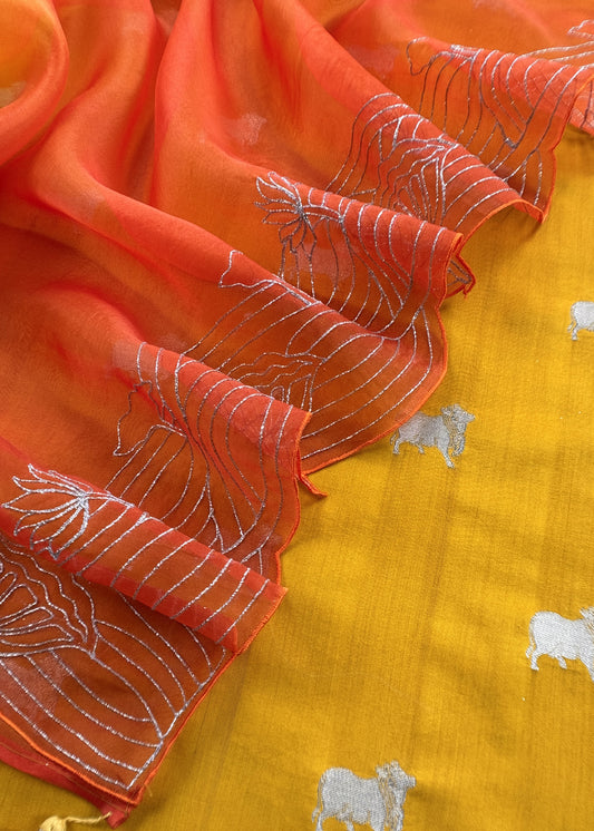 Yellow And Orange Chiniya Silk Kurta And Ombré Kora Silk Dupatta With Handwork