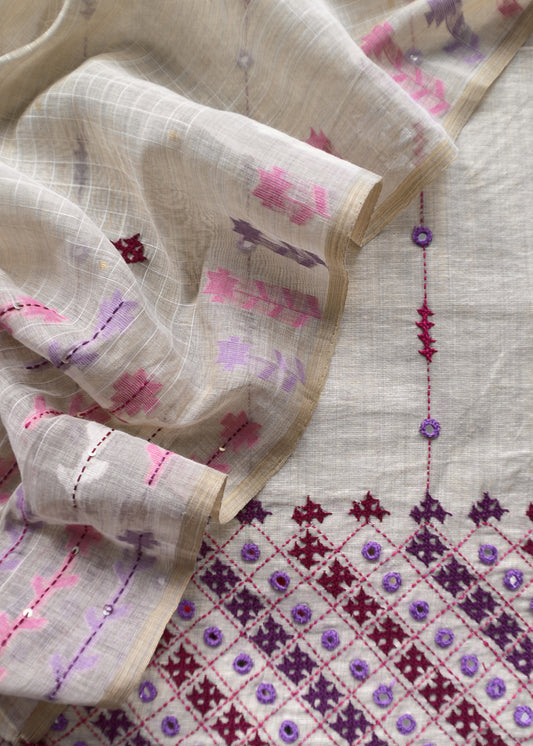Off White With Black Cotton Linen Suit With Jamdani Weaving