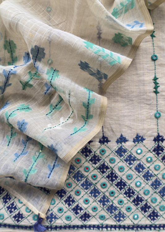 Beige With Firozi, Blue Kutch Embroidered Cotton Linen Unstitched Suit