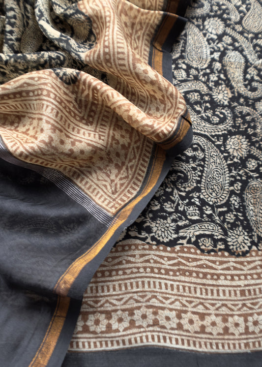 Black Paisley Block Print Pure Maheshwari Silk Unstitched Suit