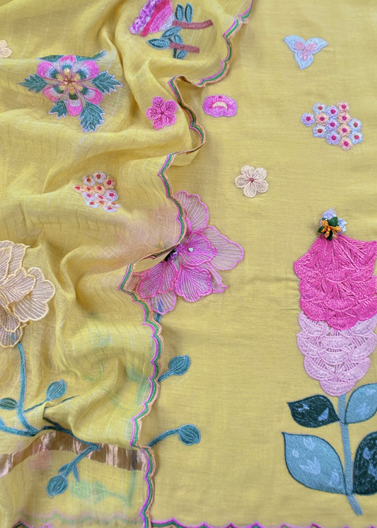 Yellow Pastel Gardens Handloom Mulmul Embroidered Suit Set With 3d Applique Work