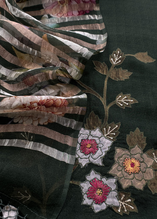 Forest Green Kora Silk Suit Fabric With Appliqué Work And Hand Embroidery