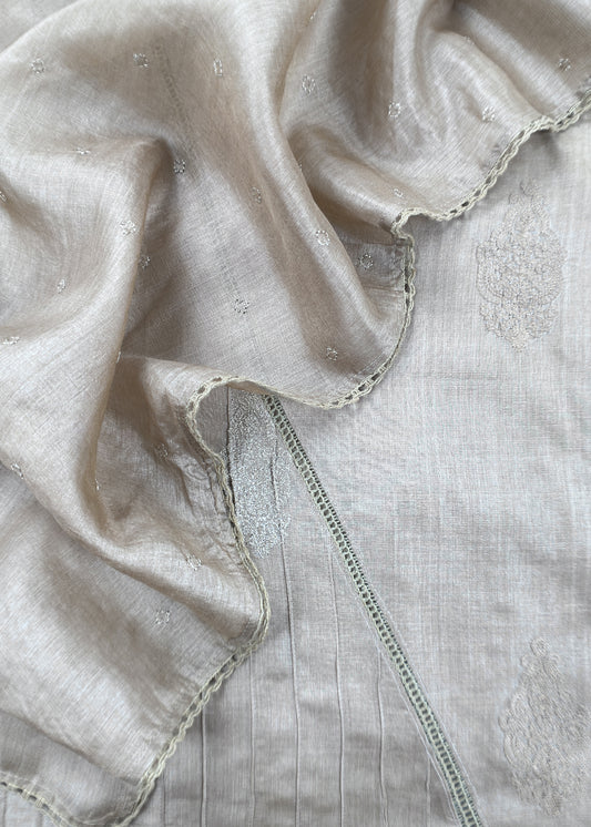 Light Grey Pure Mul Chanderi Suit With Chidiya French Thread Embroidery