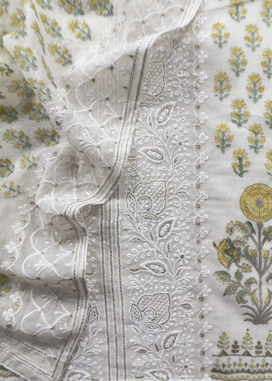 Yellow Pure Mul Cotton Hand-block Print Suit With Gold And Resham Embroidery