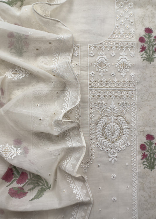 White With Pink Pure Mul Handblock Print Suit With Chikan Embroidery
