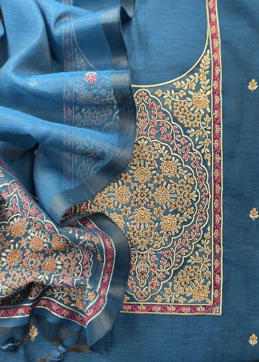 Blue Linen Chanderi Suit Fabric With Jamdani Weaving And Embroidery