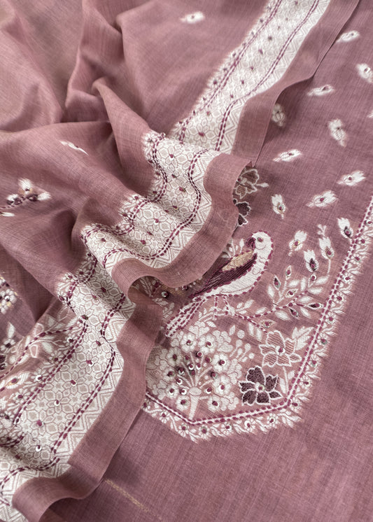 Lilac Linen Chanderi Suit Fabric With Flamingo Jamdani Weaving
