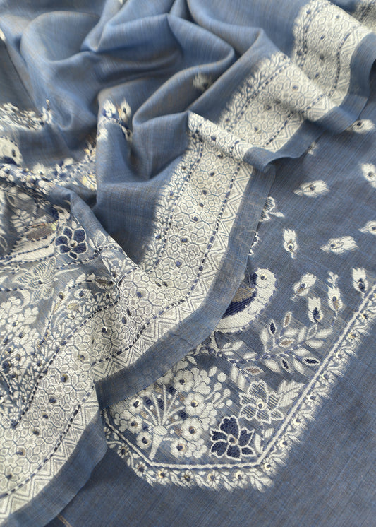 blue Linen Chanderi Unstitched Suit With Jamdani Weaving