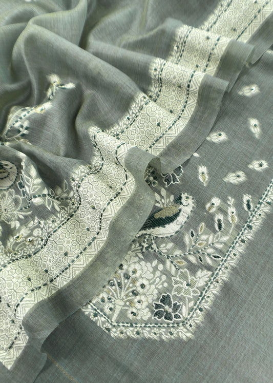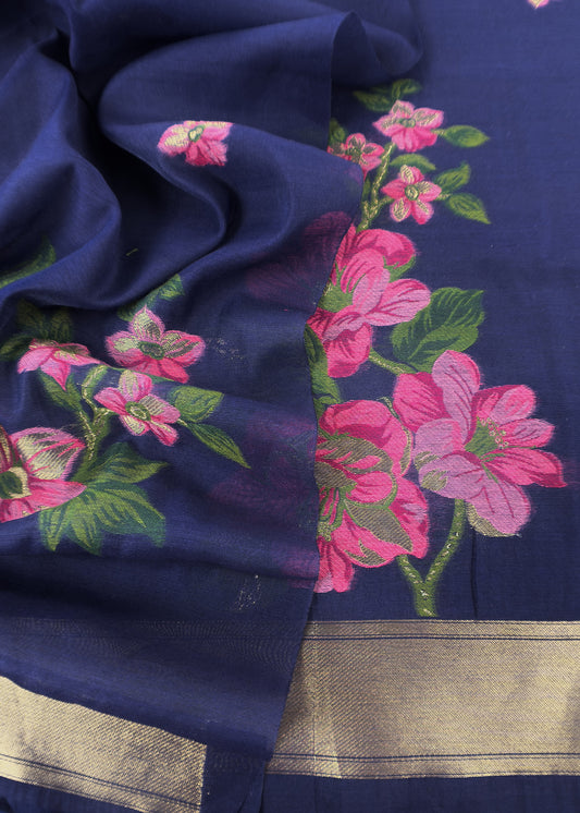Bule Floral Jamdani Weaved Unstitched Suit In Chanderi