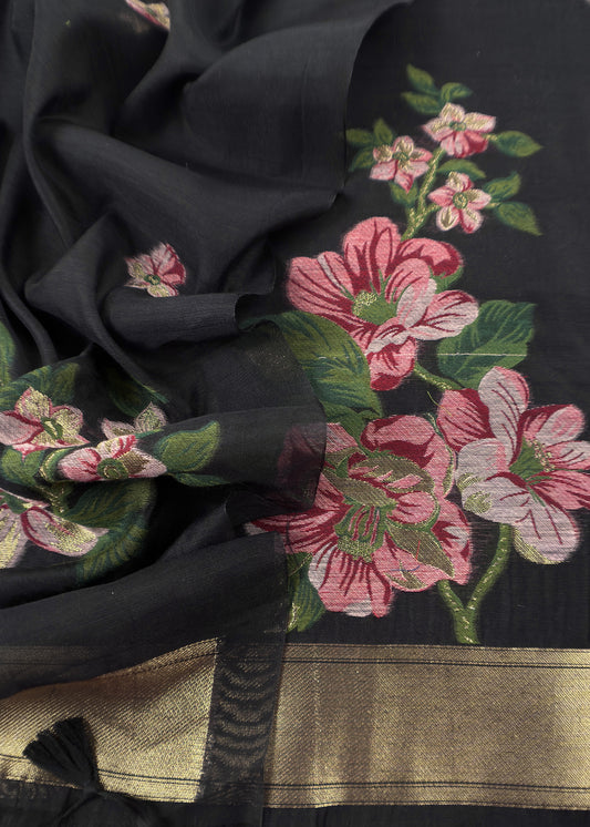 Black Floral Jamdani Weaved Unstitched Suit In Chanderi