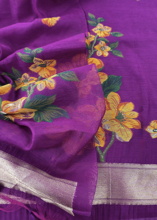 Purple Floral Jamdani Weaved Unstitched Suit In Chanderi