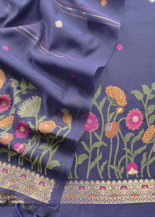 Blue Floral Jamdani Weave Unstitched Chanderi Suit