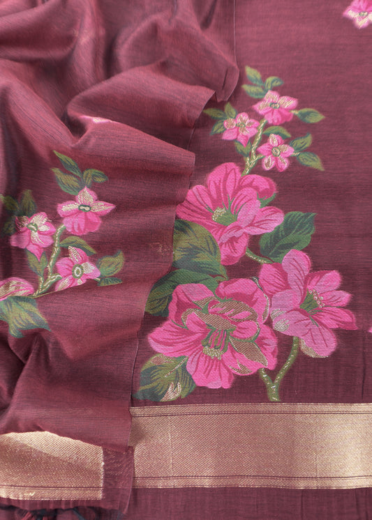 Brown Floral Jamdani Weaved Unstitched Suit In Chanderi