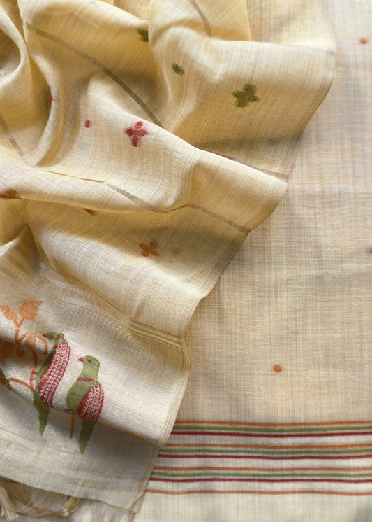 Pastel Yellow Linen Chanderi Suit Fabric with Flamingo Jamdani weaving