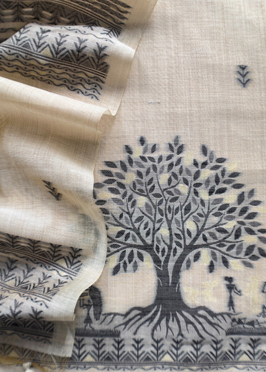 Beige Linen Chanderi Suit Fabric With Traditional Jamdani Weaving