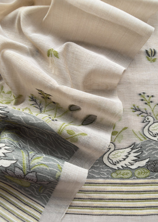 Chikoo Lotus And Swans Jamdani Suit In Linen Chanderi