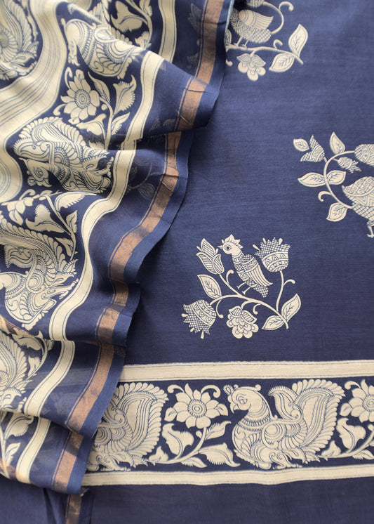Navy Blue Kalamkari Mor Maheshwari Silk Unstitched Suit