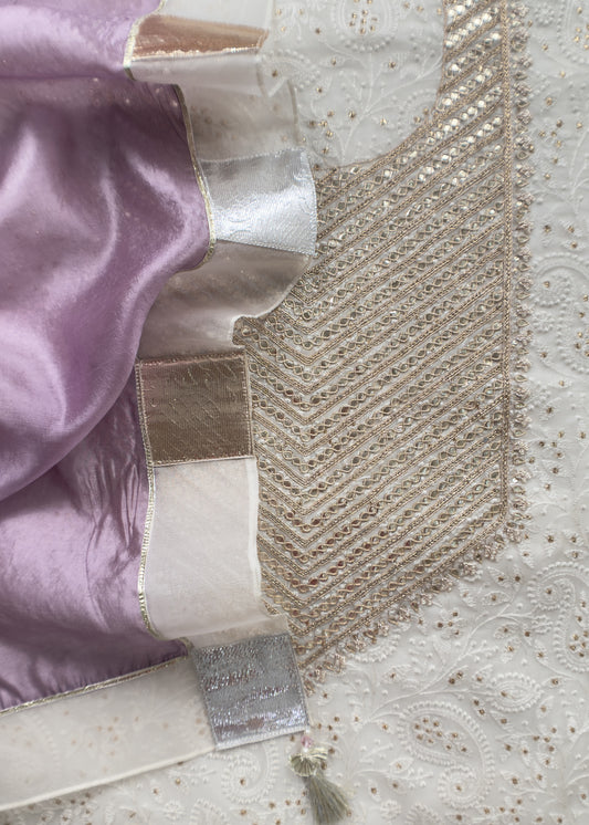 Luxe Violet Silk Suit Fabric And Organza Panel Dupatta With Dabka, Dori And Zardosi Handwork