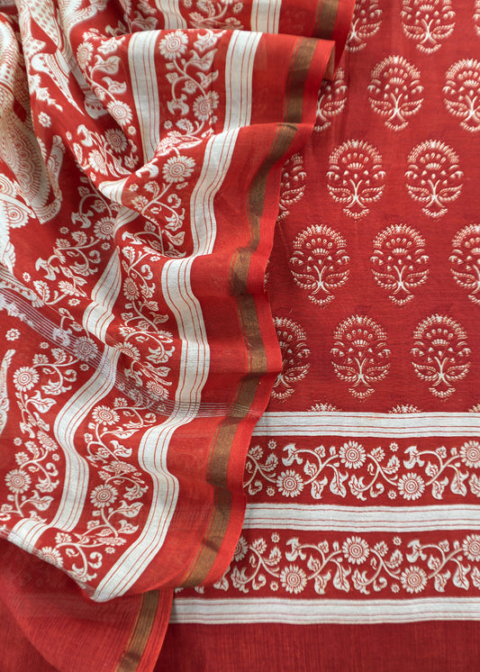 Orange Block Print Handloom Maheshwari Silk Suit Fabric