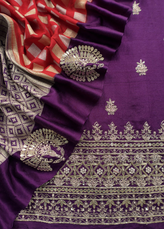 Luxe Royal Purple And Red Handloom Silk Suit With Banarasi Checks And Dabka Dori Handwork