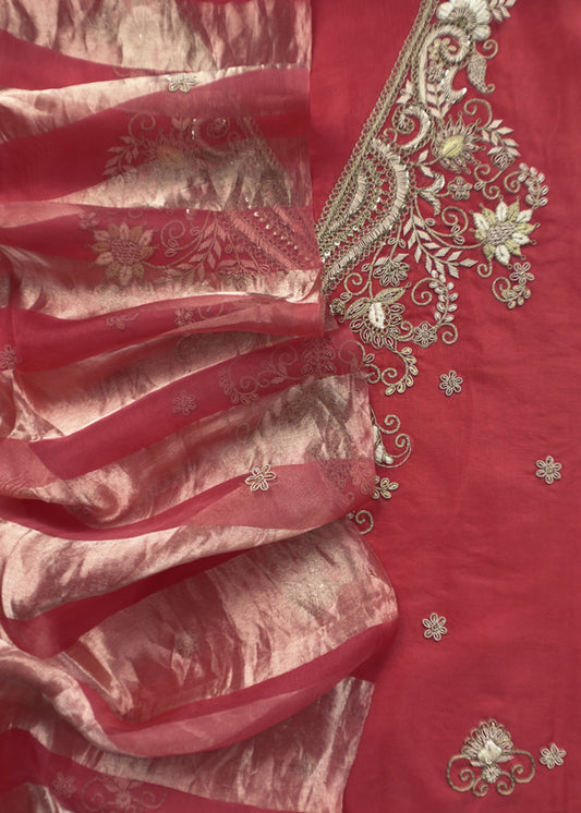 Pink Aari Embroidery Tissue Silk Suit In Applique Work