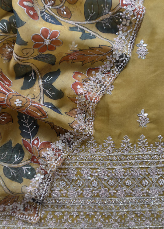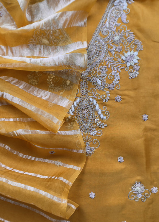 Luxe Yellow Silk Suit Fabric And Organza Panel Dupatta With Dabka, Dori And Zardosi Handwork