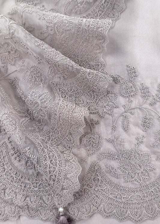 Grey Kalasheel Luxe Handloom Organza Suit With Garden French Embroidery